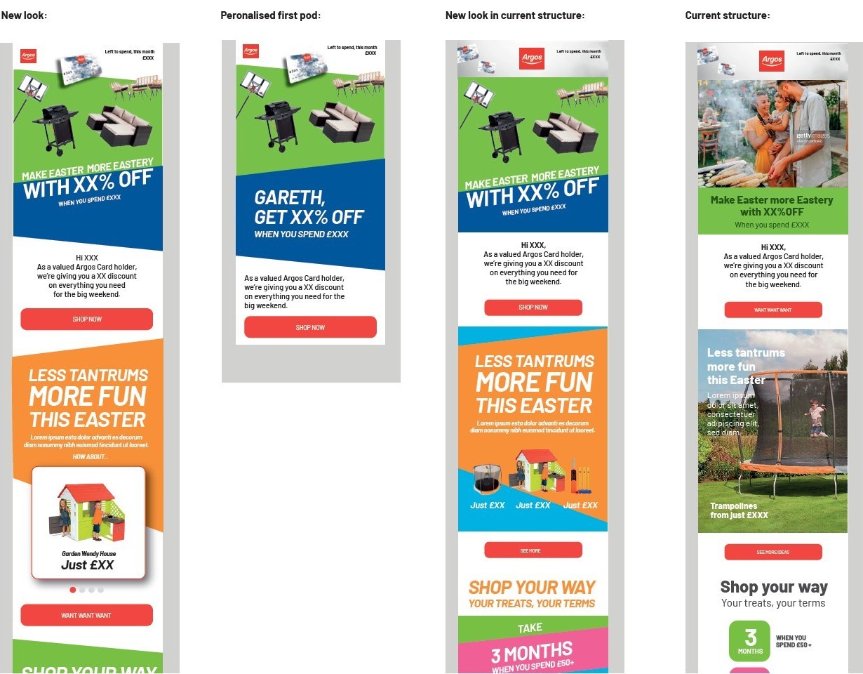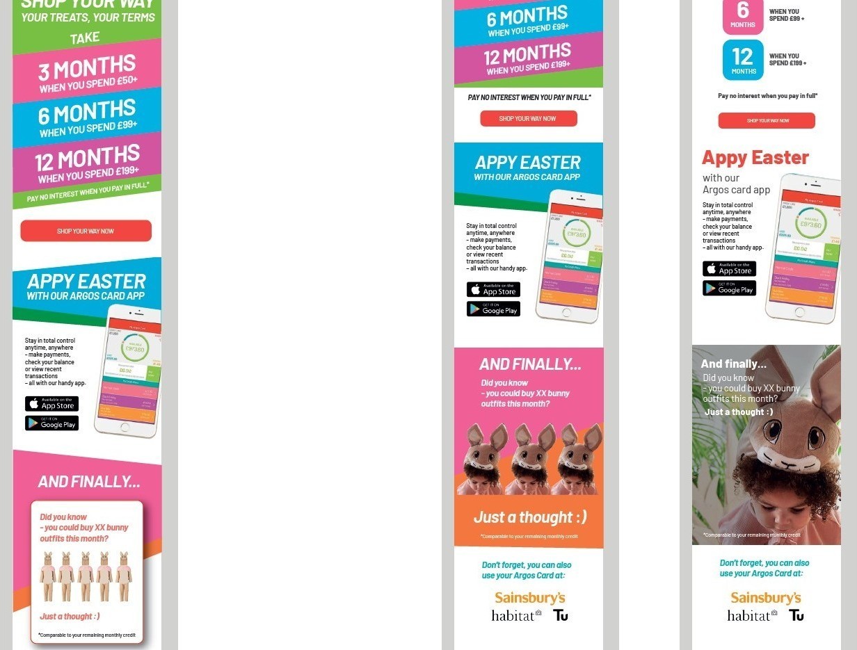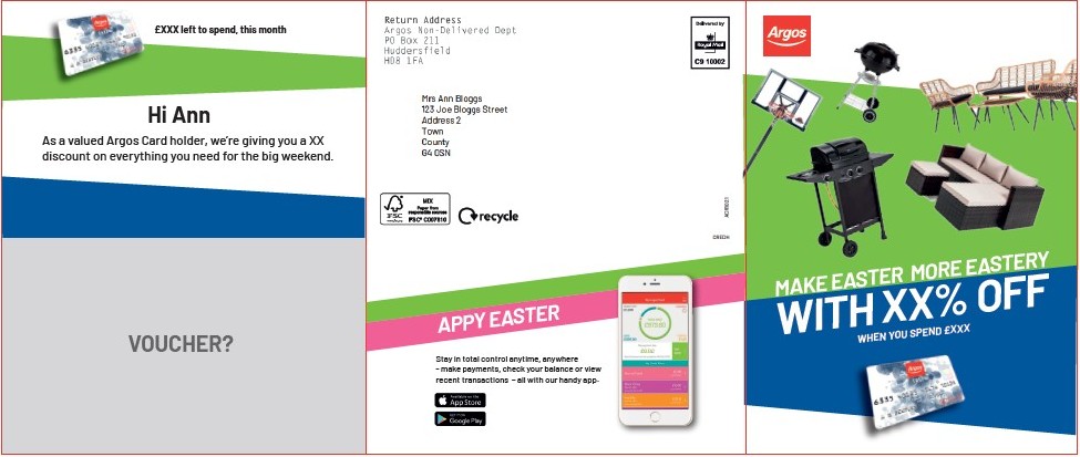 I wrote copy for Argos’s CMS, creating emails, DM and content for their app. Working within a tight messaging framework, I produced numorous copy variants, for their various customer segmentations. And together with my art director, we also created the following new look and feel for all of their CRM touchpoints, starting with a roll-fold DM…